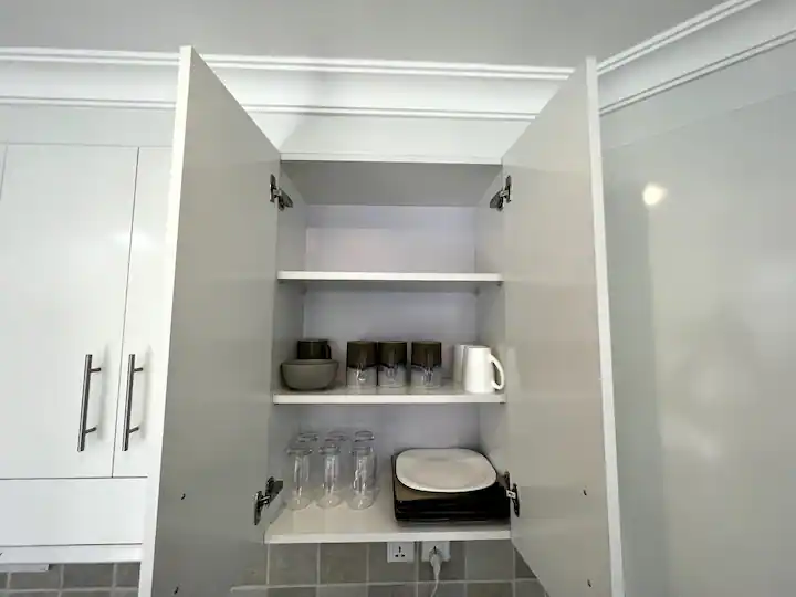 The kitchen has a refrigerator, microwave, oven, gas stove, cooking ware, kettle, French press, mugs, glasses and cutlery.